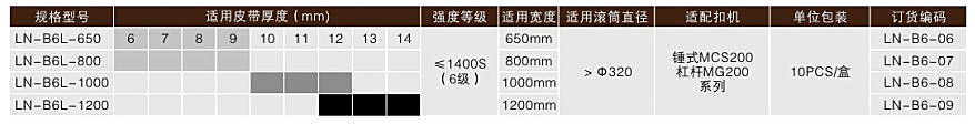 LN-B6L系列高強(qiáng)度輸送帶扣規(guī)格型號:LN-B6L-650 、LN-B6L-650、 LN-B6L-650 、LN-B6L-650。